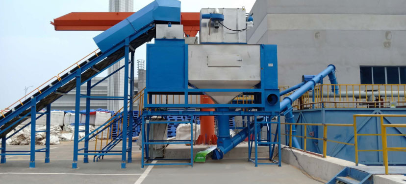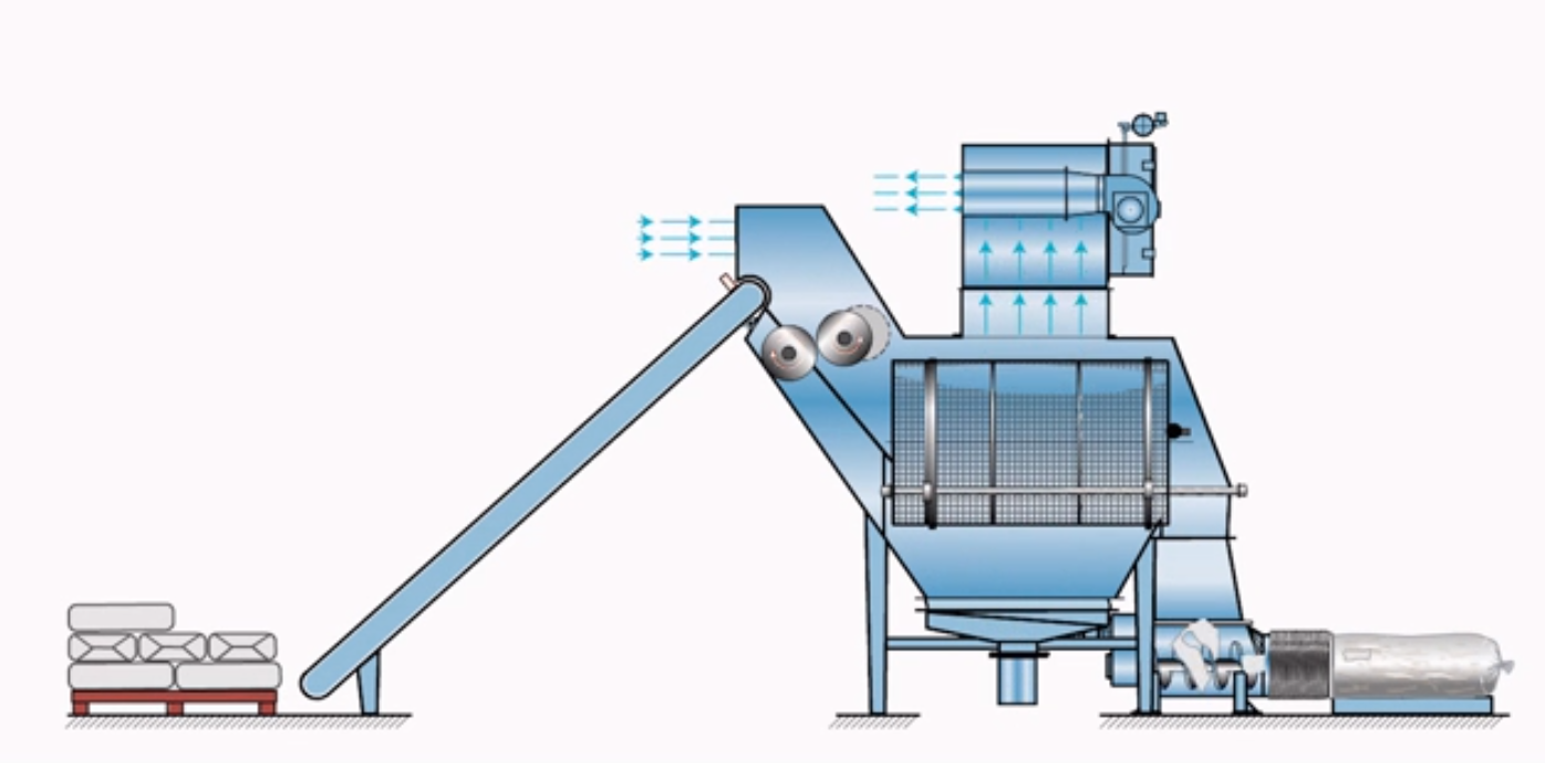 小袋自動拆包機由人工或機器人將包裝袋放到輸送機上,進(jìn)行輸送到指定位置,或進(jìn)入破碎機后自動拆包,物料自動分離落入下游設(shè)備。廢袋自動分離后自動壓縮,拆包的過程中產(chǎn)生的揚塵由過濾除塵器凈化過濾達(dá)標(biāo)后排出。